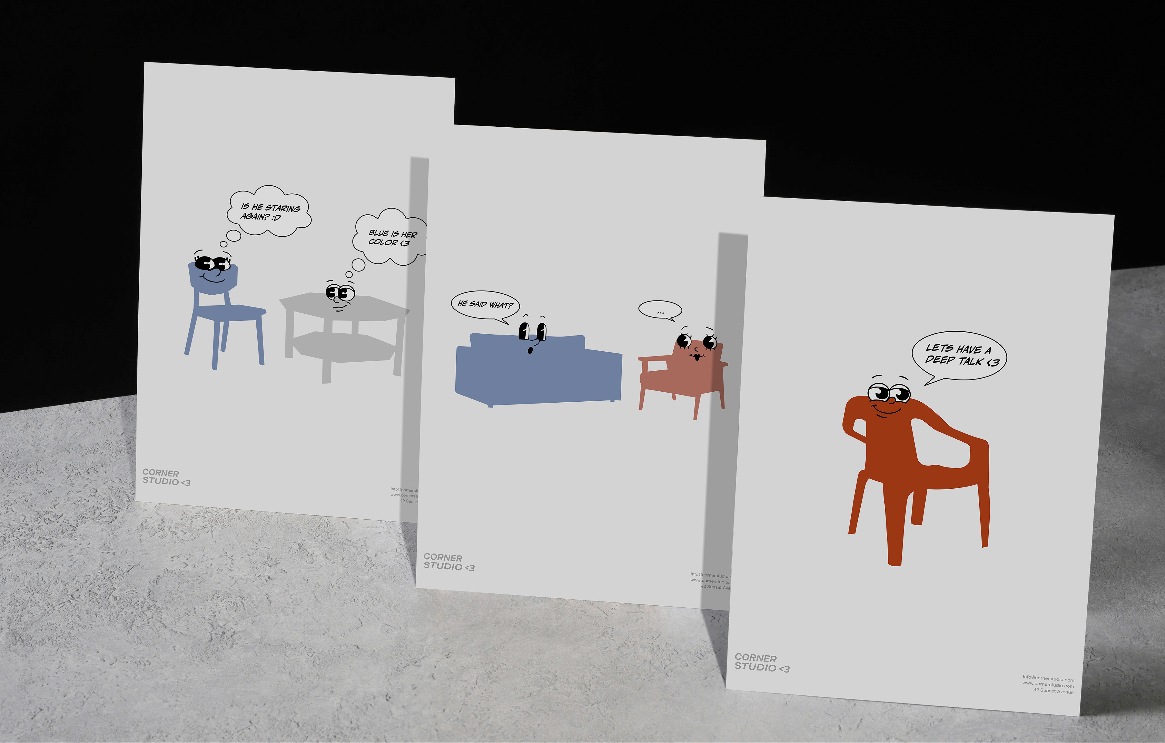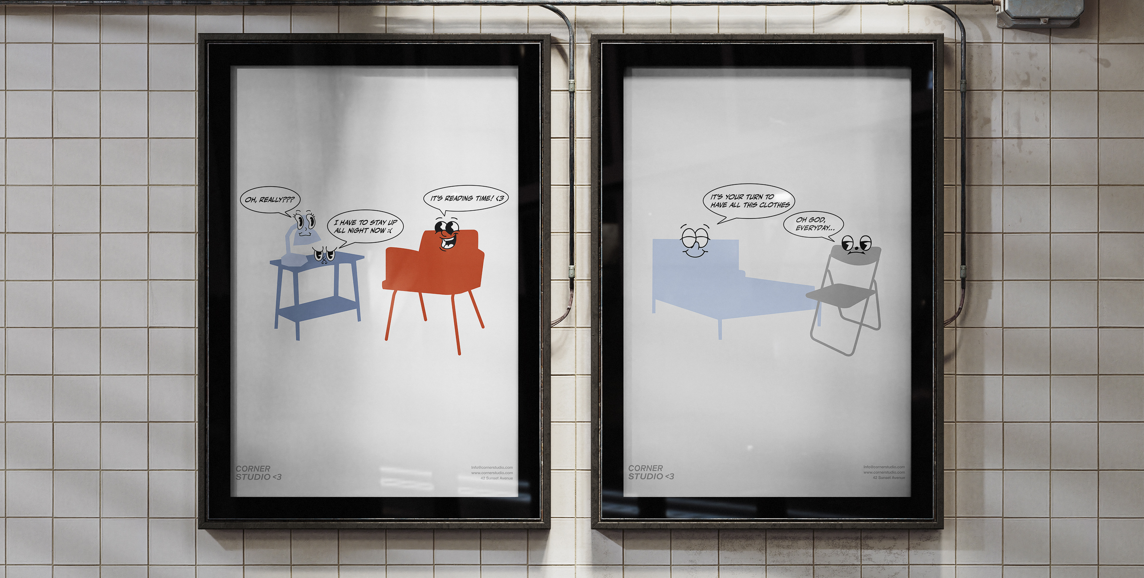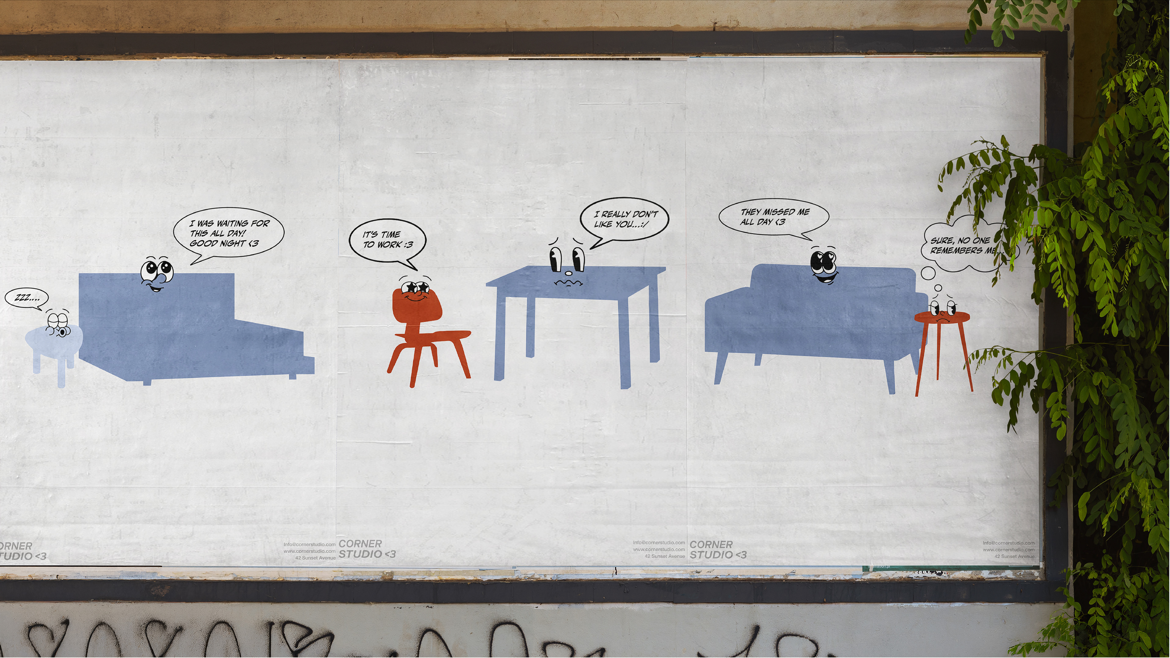 Simple emoticons and illustrated furniture characters make the brand approachable and relatable, giving everyday objects a voice and personality.