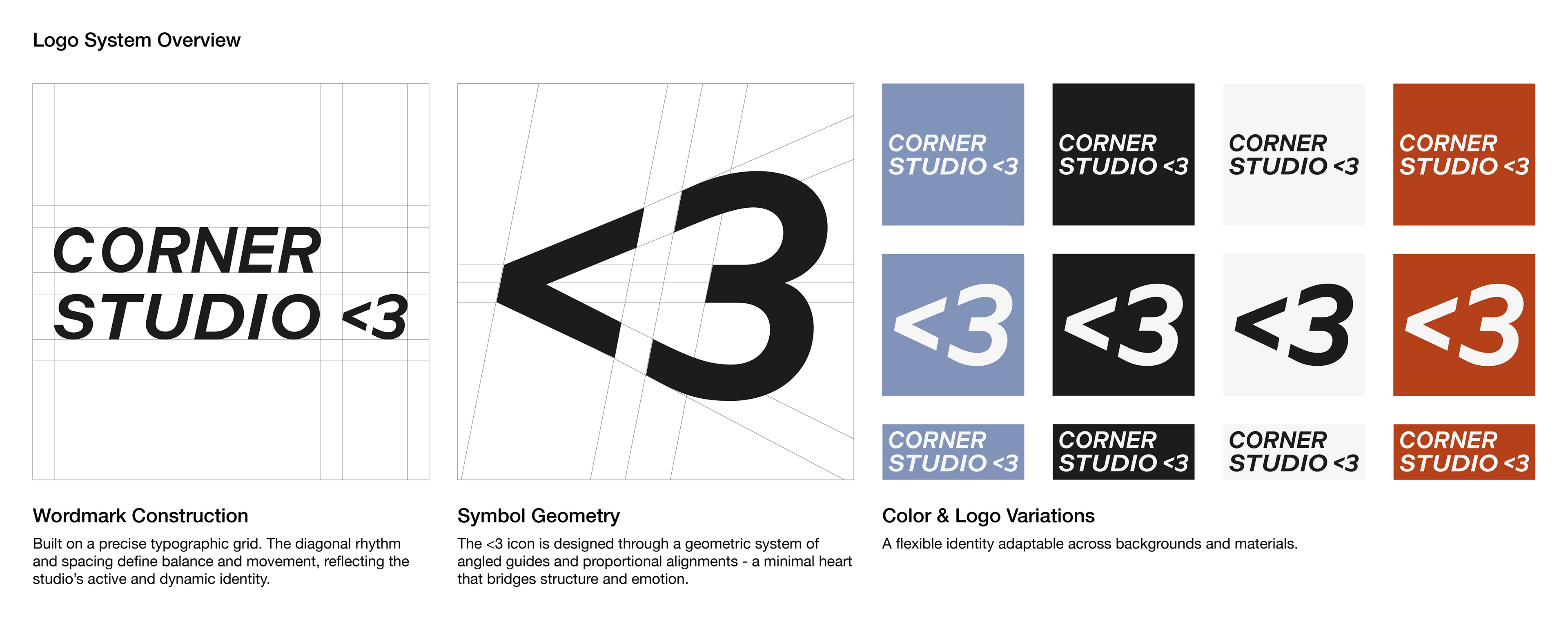 The identity system builds around a minimal typographic heart, <3, expressing emotion through a precise grid and clean geometry.