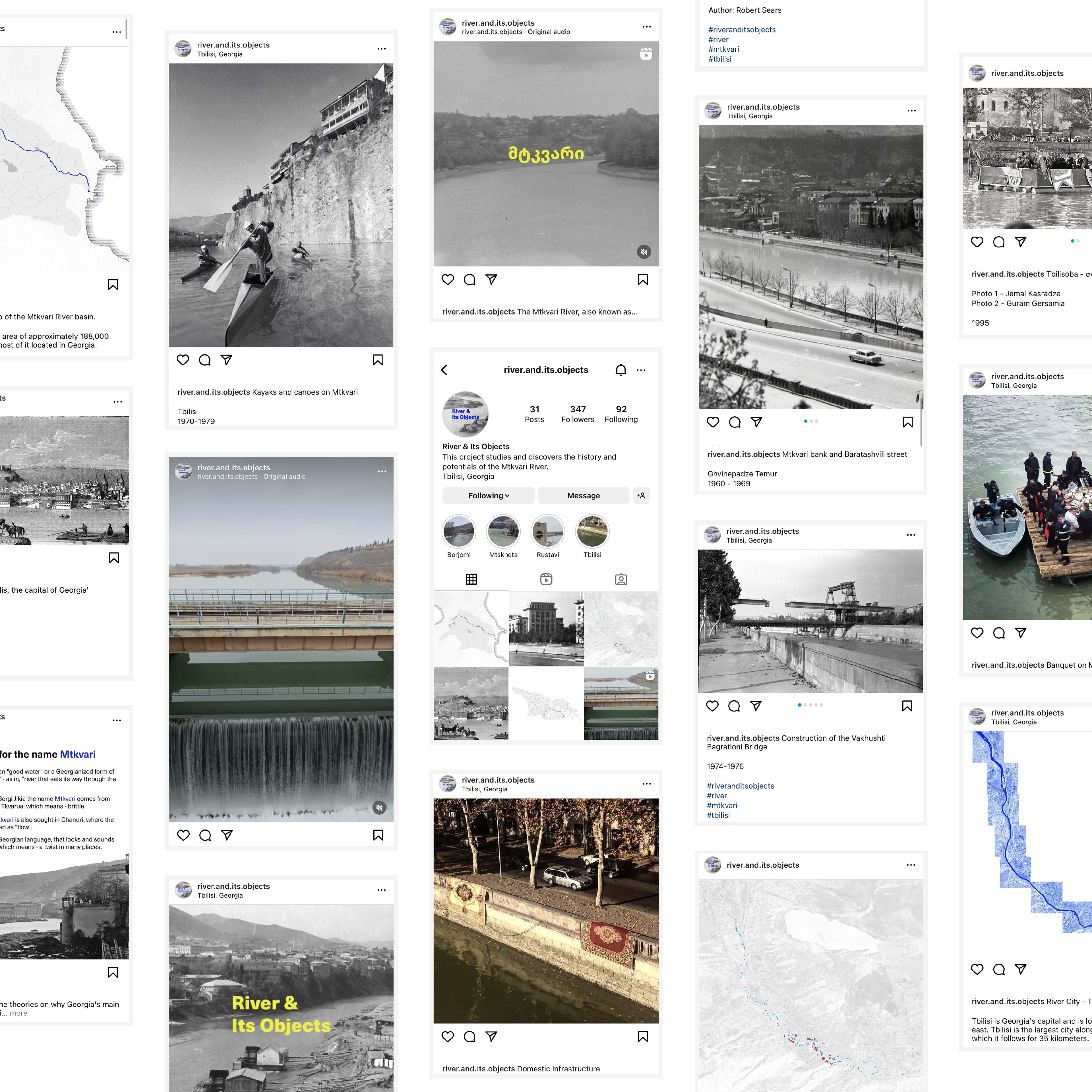 “River & Its Objects” Instagram Page - In 2022, I created the Instagram account "River & Its Objects" and began sharing maps and drawings, studies, images, and diagrams about the Mtkvari River. This knowledge prompts a reevaluation of the river's potential and opportunities. The platform's main goal is to increase public awareness and rekindle interest.