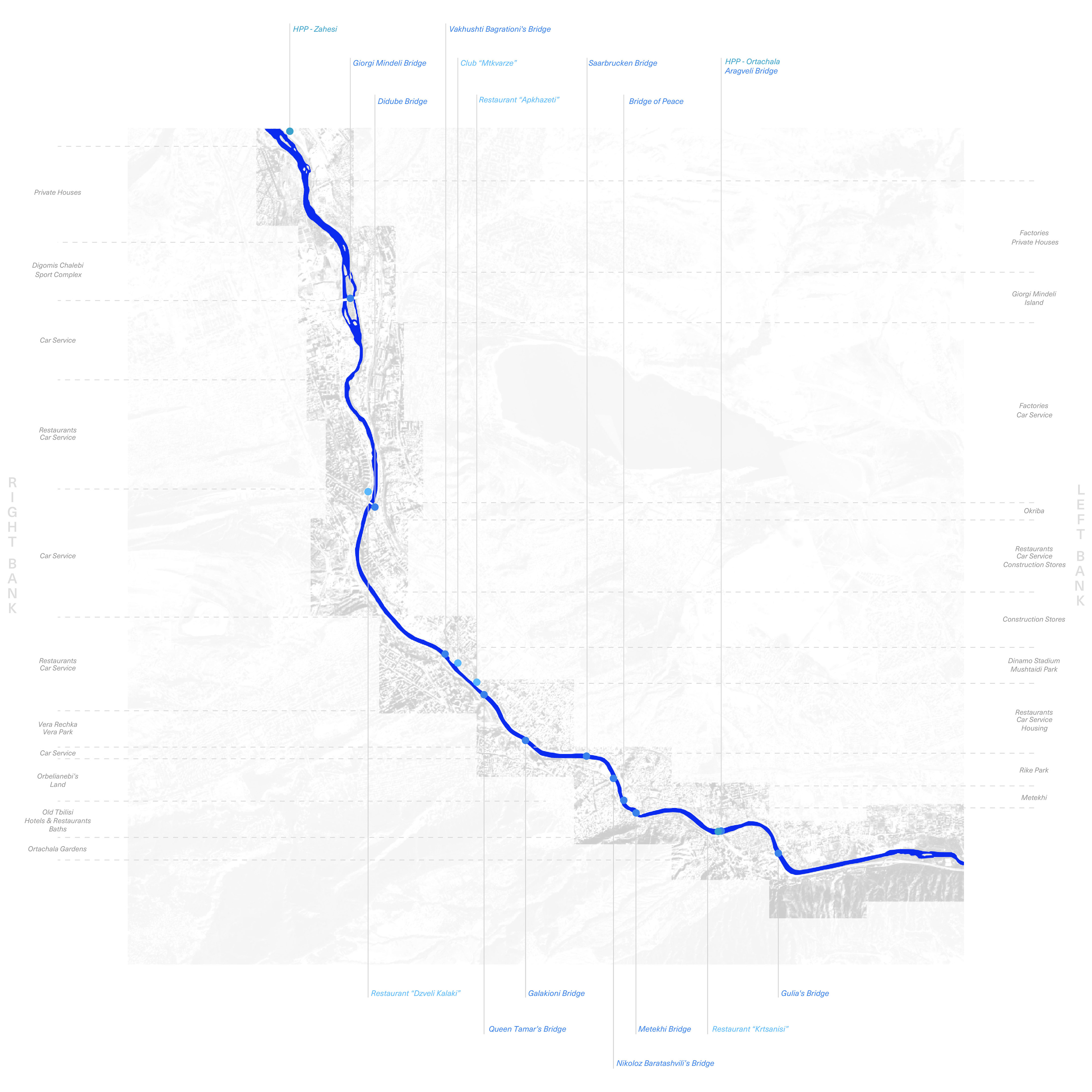 River City - Tbilisi, Georgia's capital and the largest settlement on the Mtkvari. Tbilisi's development began adjacent to the Mtkvari and expanded along its course over time. It was interesting to study the areas created between the river and the city, the acquired knowledge helps us to assume potential reasons why the river and the city are more or less separated from each other. With the same knowledge, it becomes possible to discover potential places for the future connection to the river.