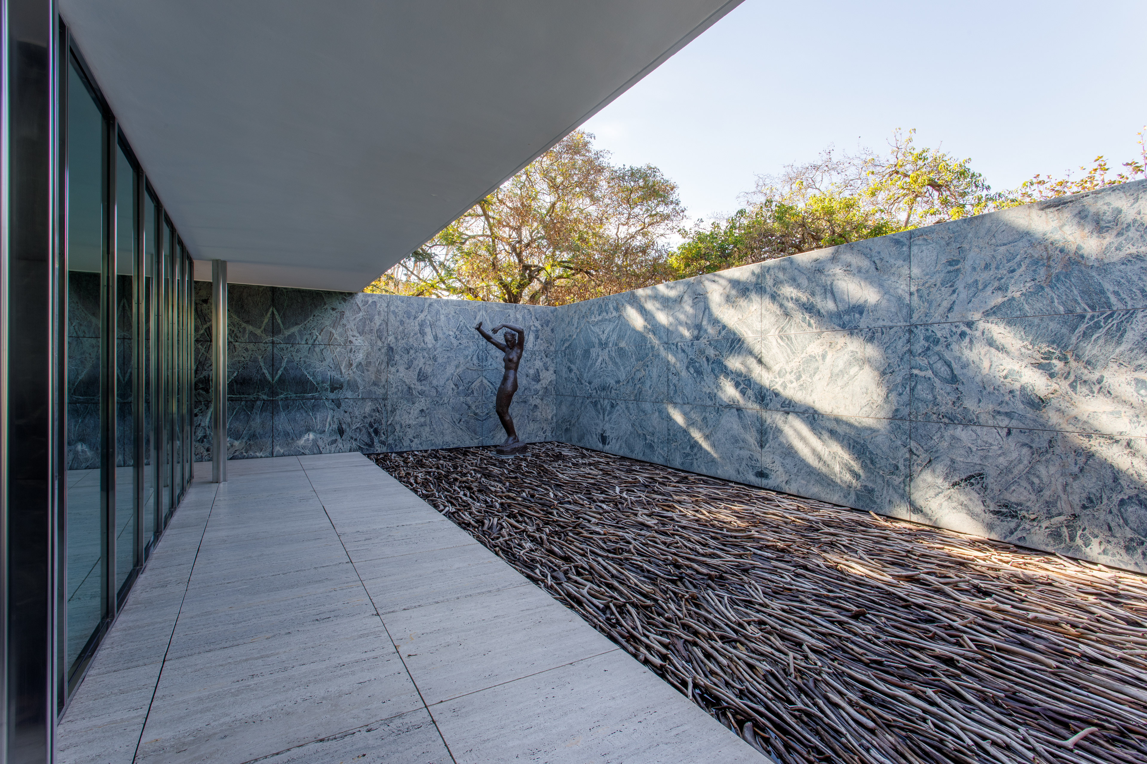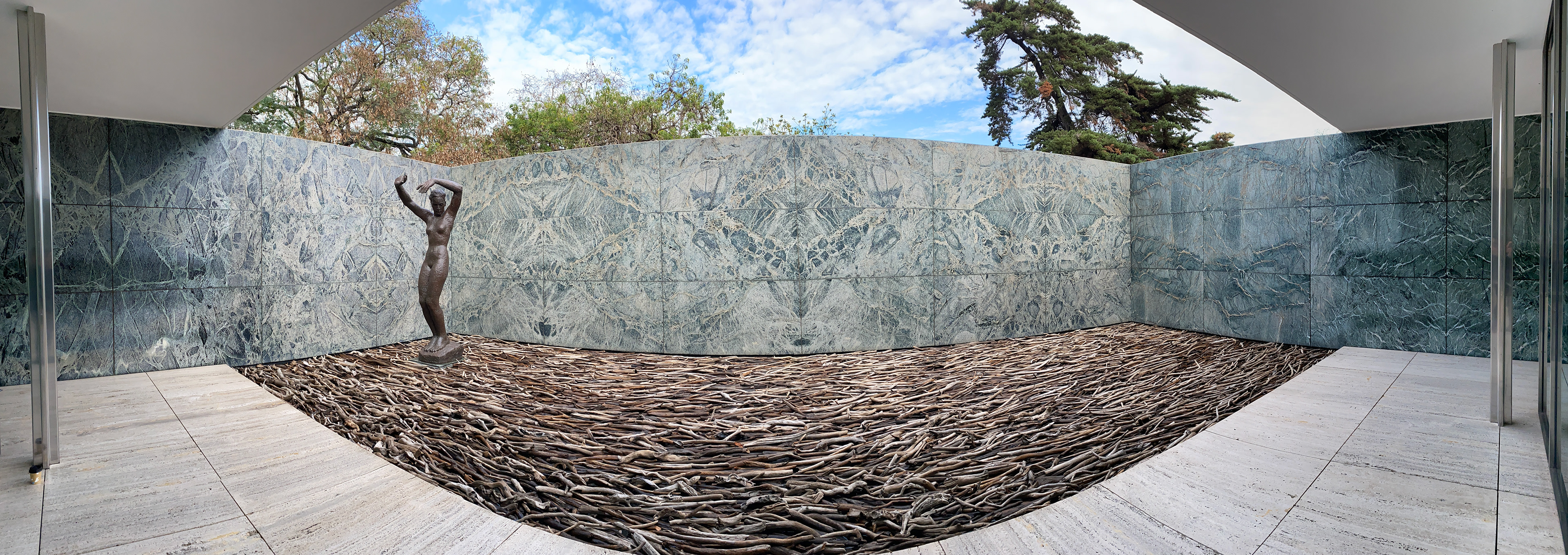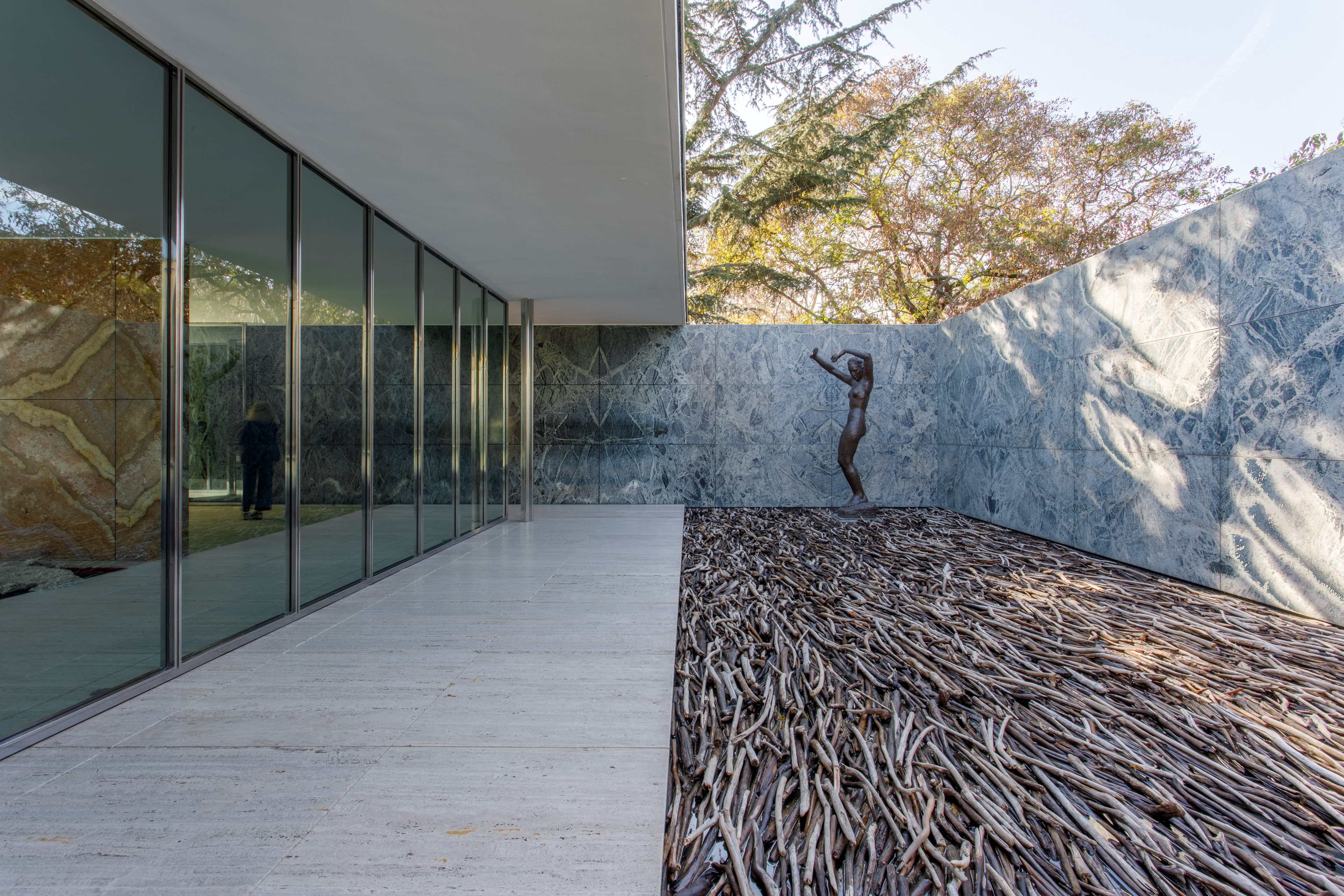 The installation Nature Morte is research-driven and explores the impact of human spatial-political development on nature, focusing on the coexistence of living and dead landscapes. The Barcelona Pavilion's small pond is transformed into a reflection of critical global processes with silver driftwood symbolising dried-up rivers, illustrating the ever-changing nature of our existence.