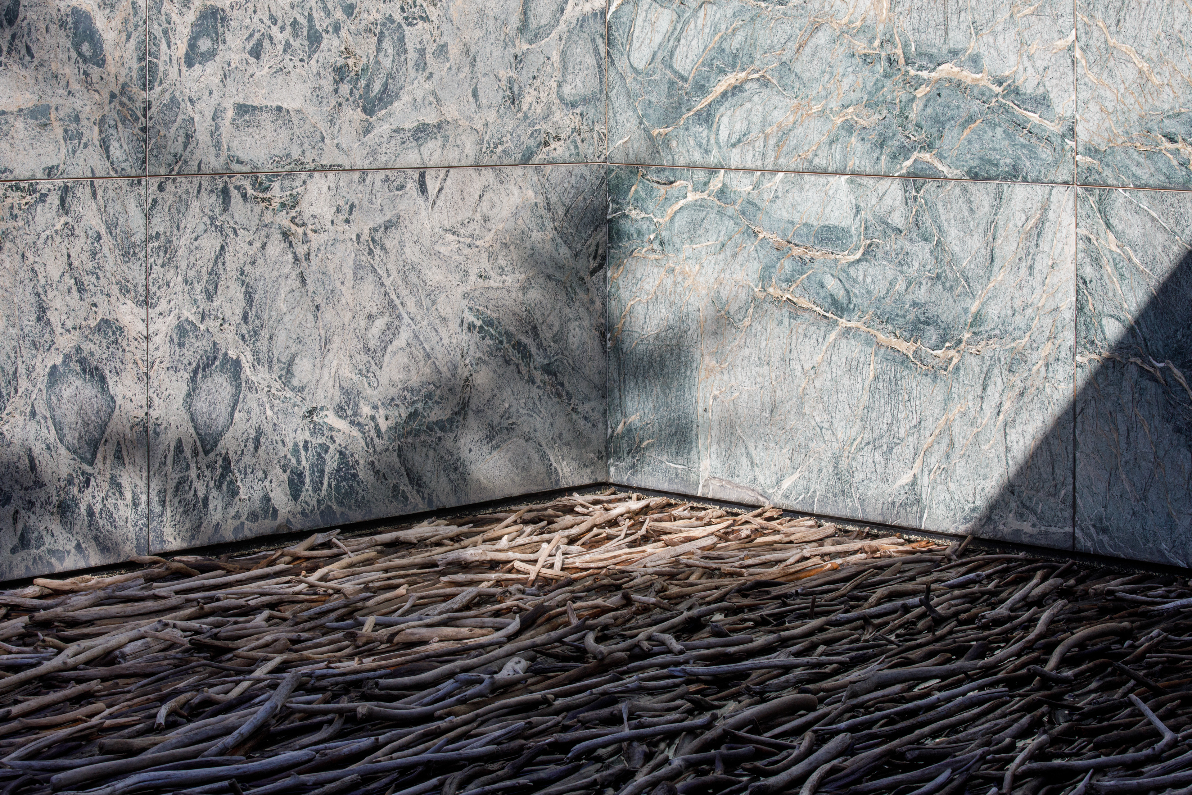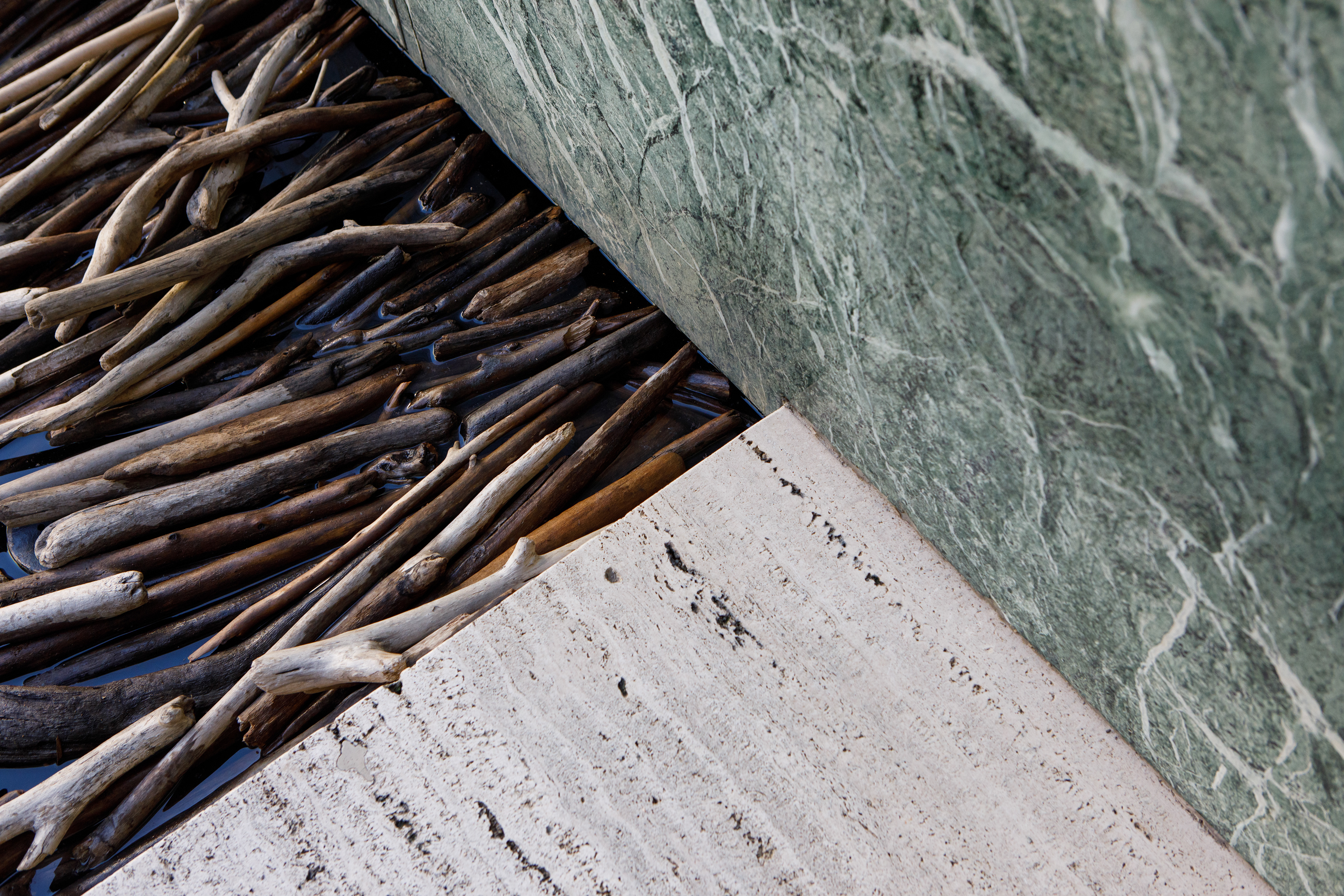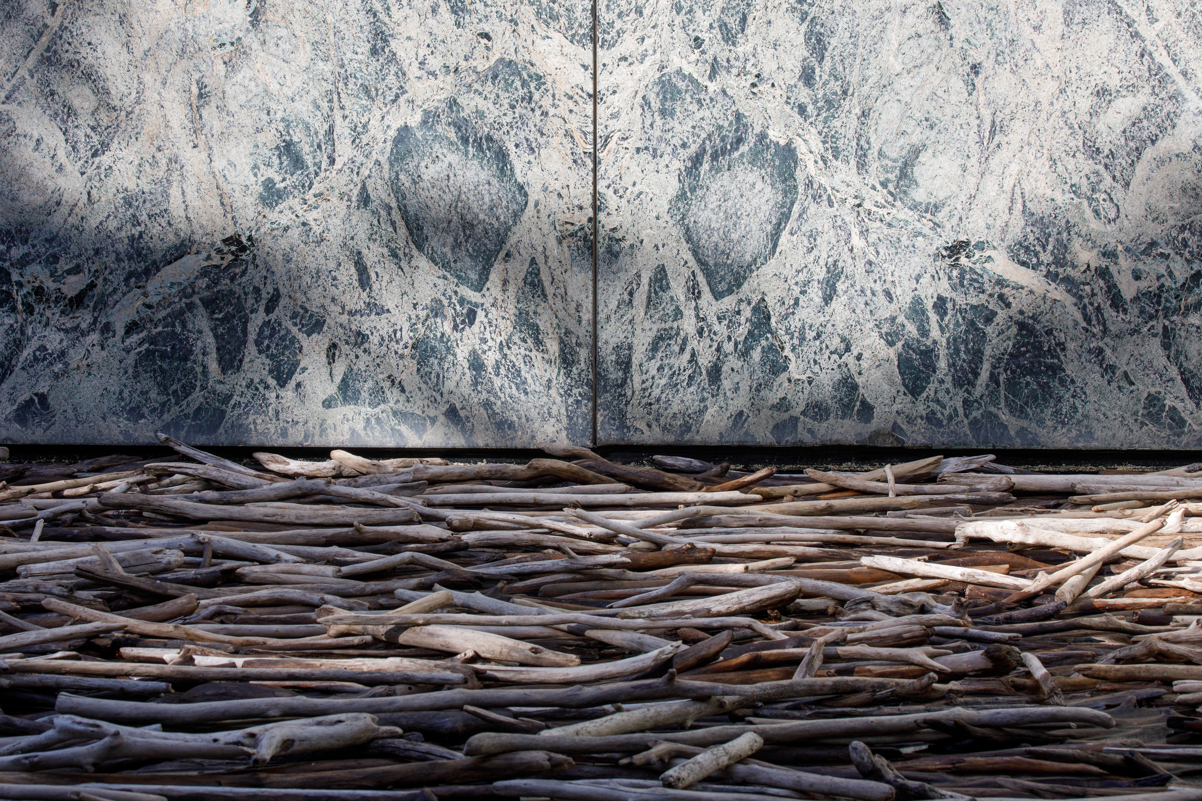 The silver-coloured pieces of wood are beautiful and poetic, shaped and weathered by the forces of the water and exposure to sunlight, wind and temperature changes. The pieces of deadwood are assembled into a large horizontal surface on the water, creating an interesting dialogue between their texture and the pure, well-defined geometry of the Pavilion. The emissivity of the driftwood emphasises the reflectivity of the surrounding materials, such as onyx, marble and glass. The sculpture's reflection in the water is fragmented and almost disappears. The silver shimmering pieces move gently according to weather conditions, such as sun, wind or rain. Their soft, graceful movements reflect the flow of life as a reminder of the ever-changing nature of our existence."