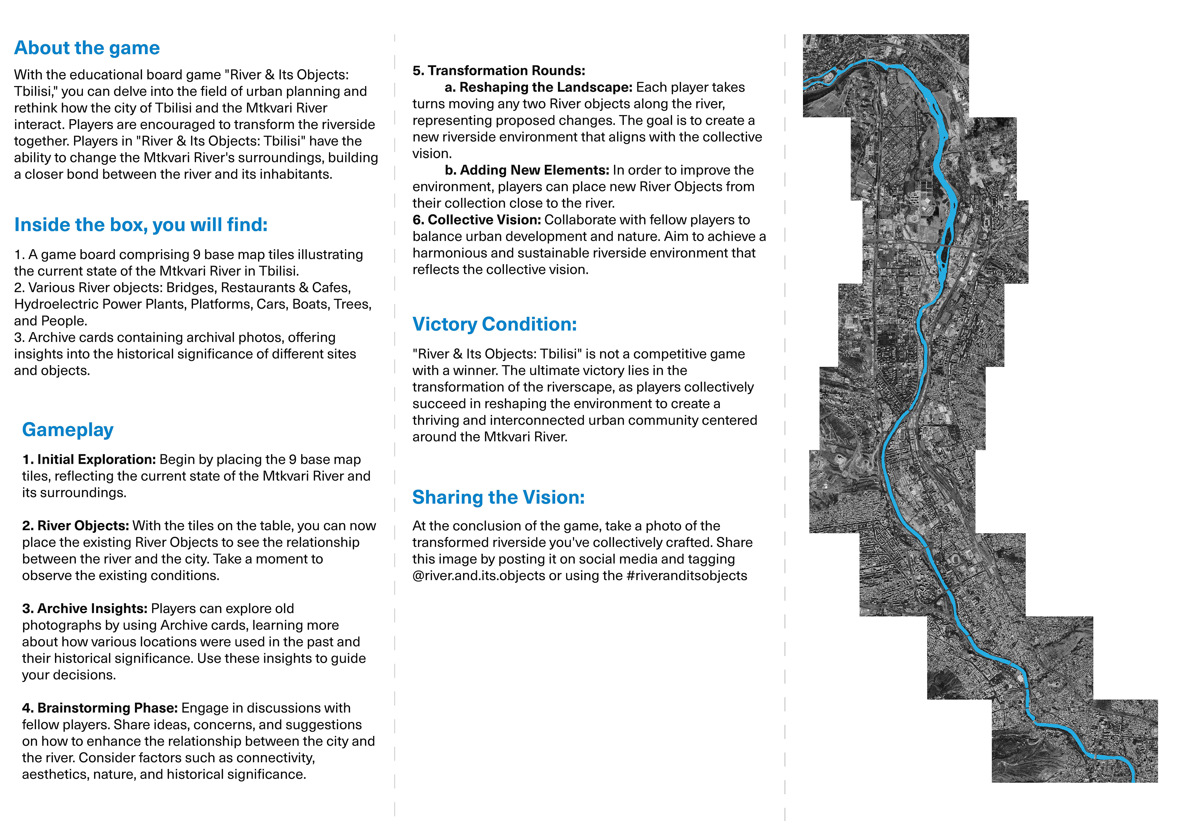 "River & Its Objects: Tbilisi" is an educational board game that allows players to explore the world of urban planning and reimagine the relationship between the city of Tbilisi and the Mtkvari River. In this game, participants collaborate to transform the river's surroundings, creating a stronger connection between the river and the city's residents.
